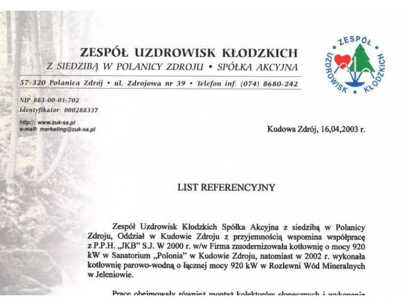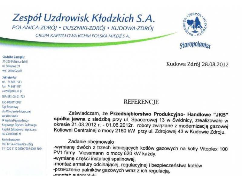 GENERALNY WYKONAWCA: Modernizacja kotłowni w obiektach sanatoryjnych i w Zakładzie Produkcji Wód Mineralnych „Staropolanka" w Jeleniowie.