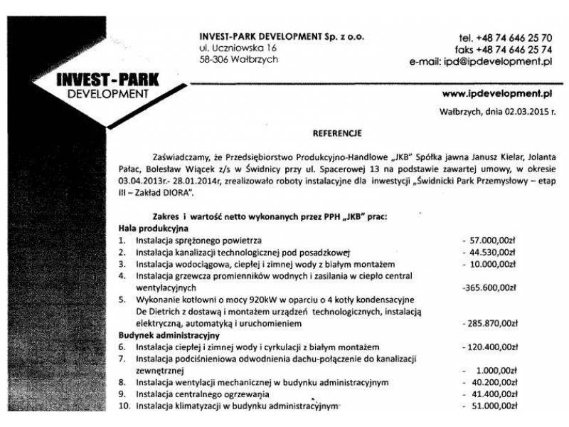 Budowa nowego Zakładu „Diora” w Świdnicy przy ul Towarowej. PODWYKONAWCA wewnętrznych instalacji sanitarnych, grzewczych i technologicznych oraz kotłowni. Generalny Wykonawca INVEST-PARK DEVELOPMENT Wałbrzych. Szczegółowy zakres robót w referencjach.